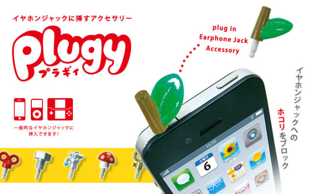 De moda entre los adolescentes nipones, el Plugy es un accesorio para la entrada de los auriculares de cualquier aparato. Cuando no tengas los auriculares conectados, pon el Plugy y haz que tu iPod, iPhone, DS... sea la envidia de todos tus amigos. Hay multitud de modelos y temáticas (coches, animales, flores, etc).